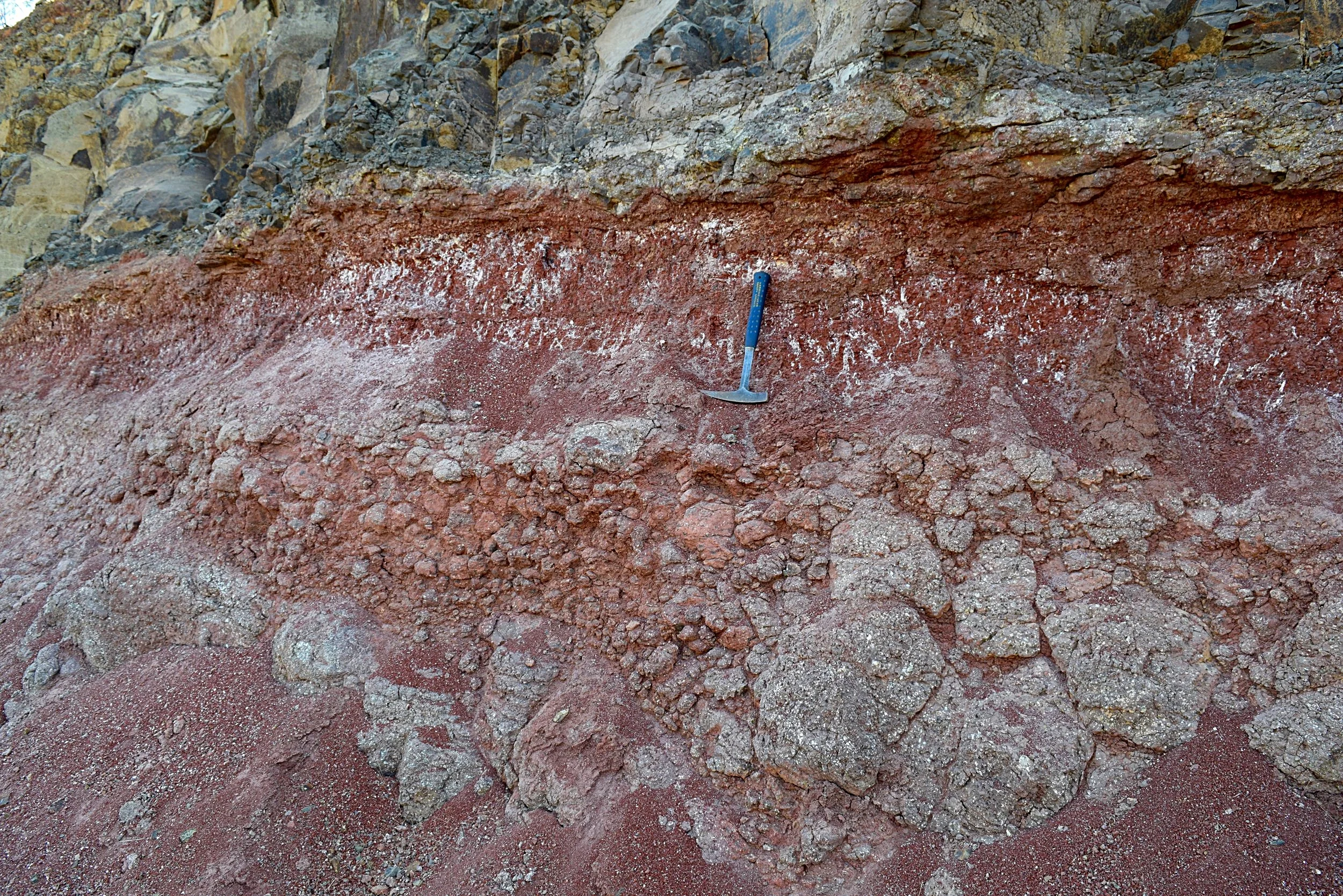 Paleosol (red bole) between two basalt flows within the Deccan Traps. Here you can see the paleosol forming a thick mantle between the flows and filling voids in the flow top breccia of the lower flow.