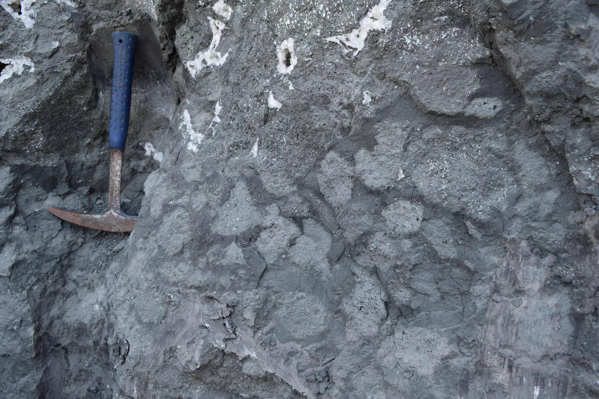 Clasts of basalt within a mafic tuff between Pune and Mahabaleshwar.